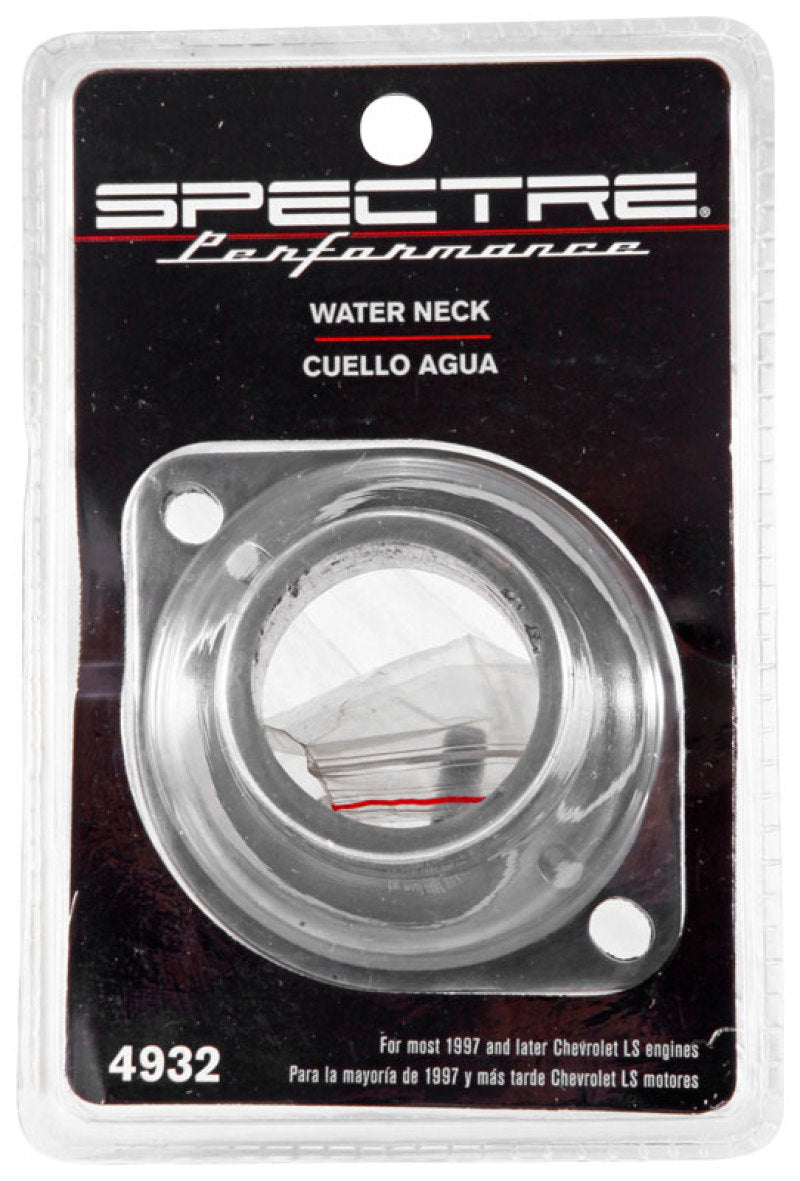 The Spectre straight LSx water neck can be used on any 1997 and later LSx vehicle application that requires that the water neck point straight forward. The water neck is made from polished aluminum and is designed to use OEM style thermostats. Stainless steel bolts are included for installation.